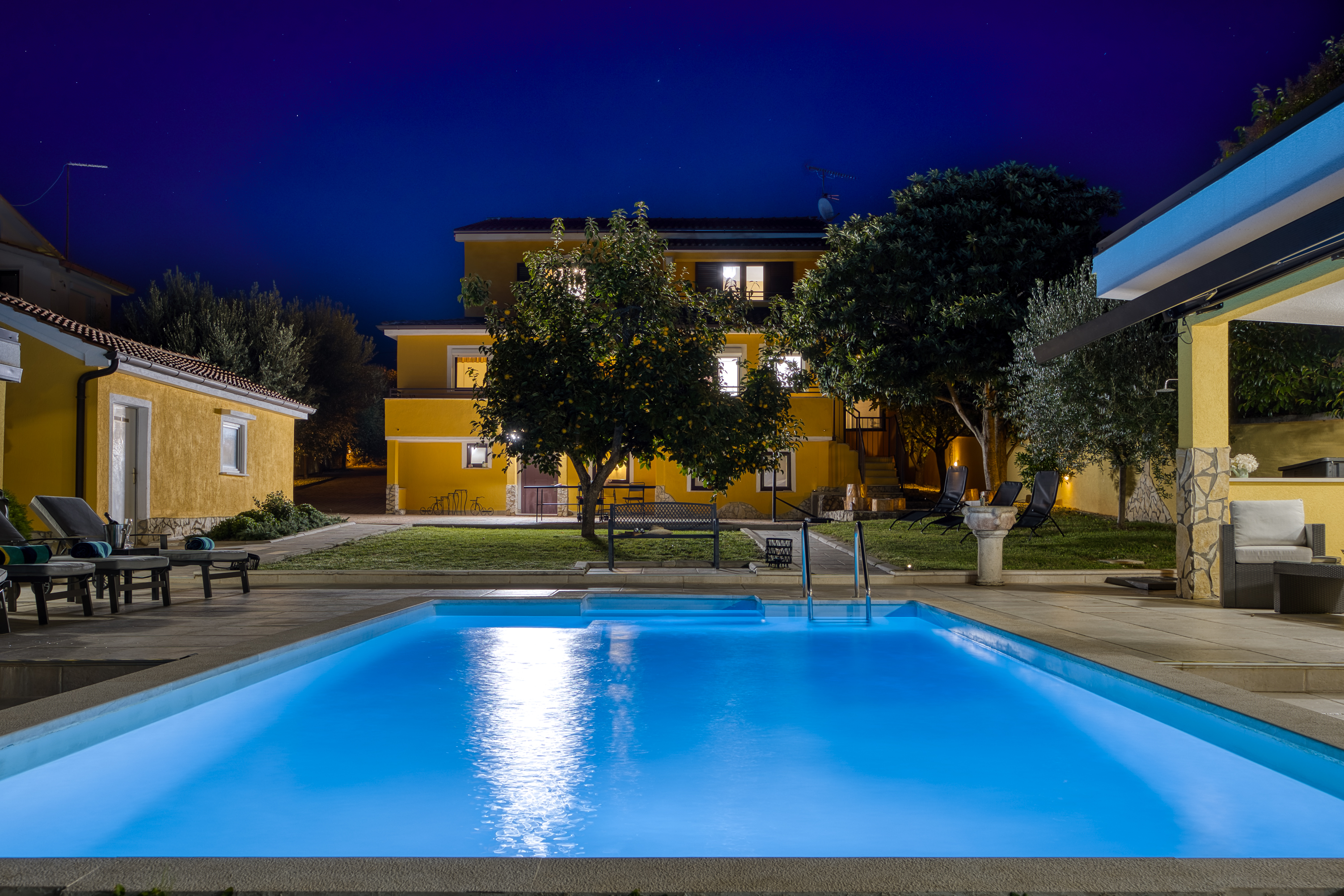 Velika okućnica omogućava nesmetano uživanje uz omiljene hobije, piće, druženje, odmaranje na udobnim ležaljkama uz bazen, ili za one aktivnije igranje košarke i stolnog tenisa.